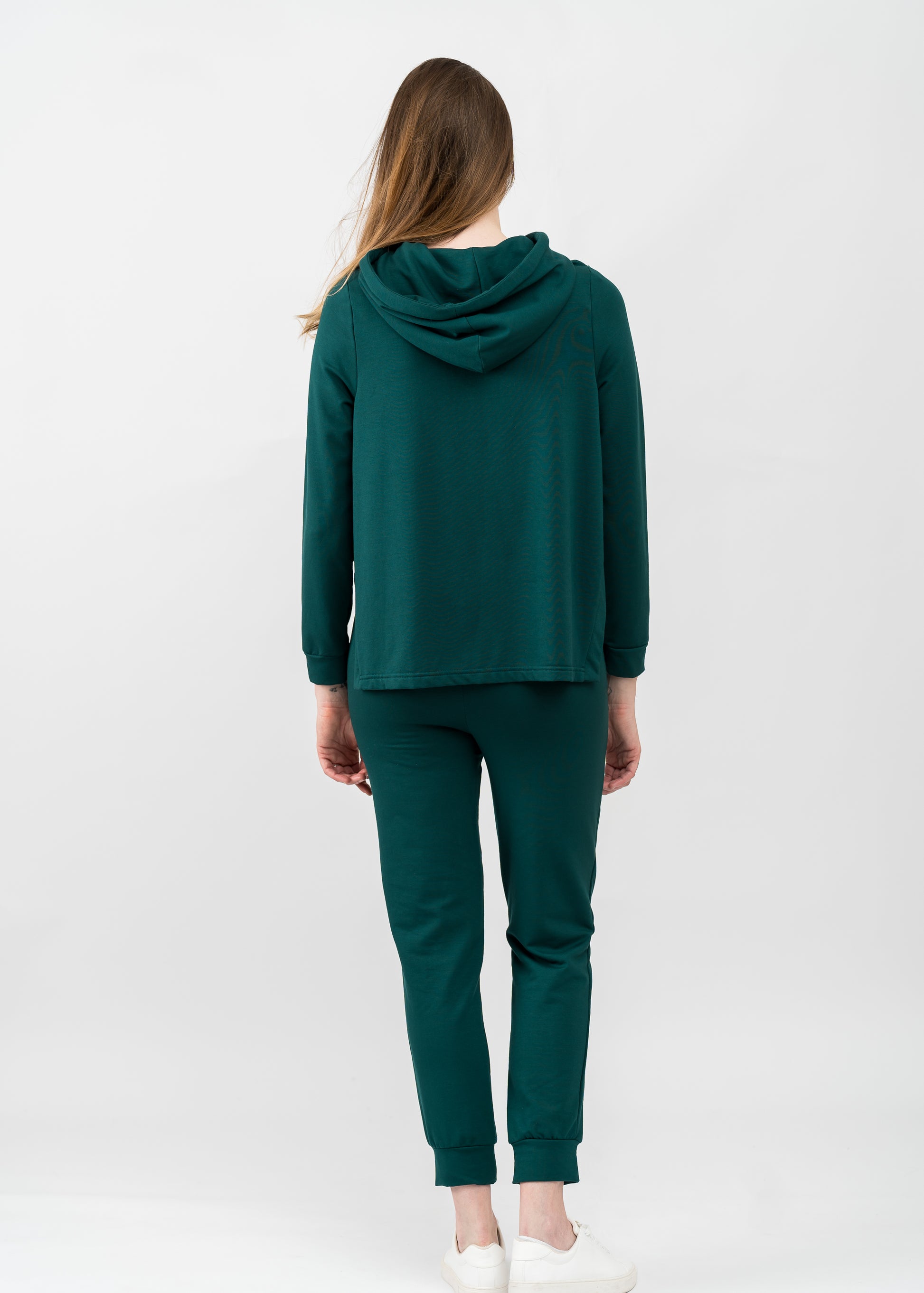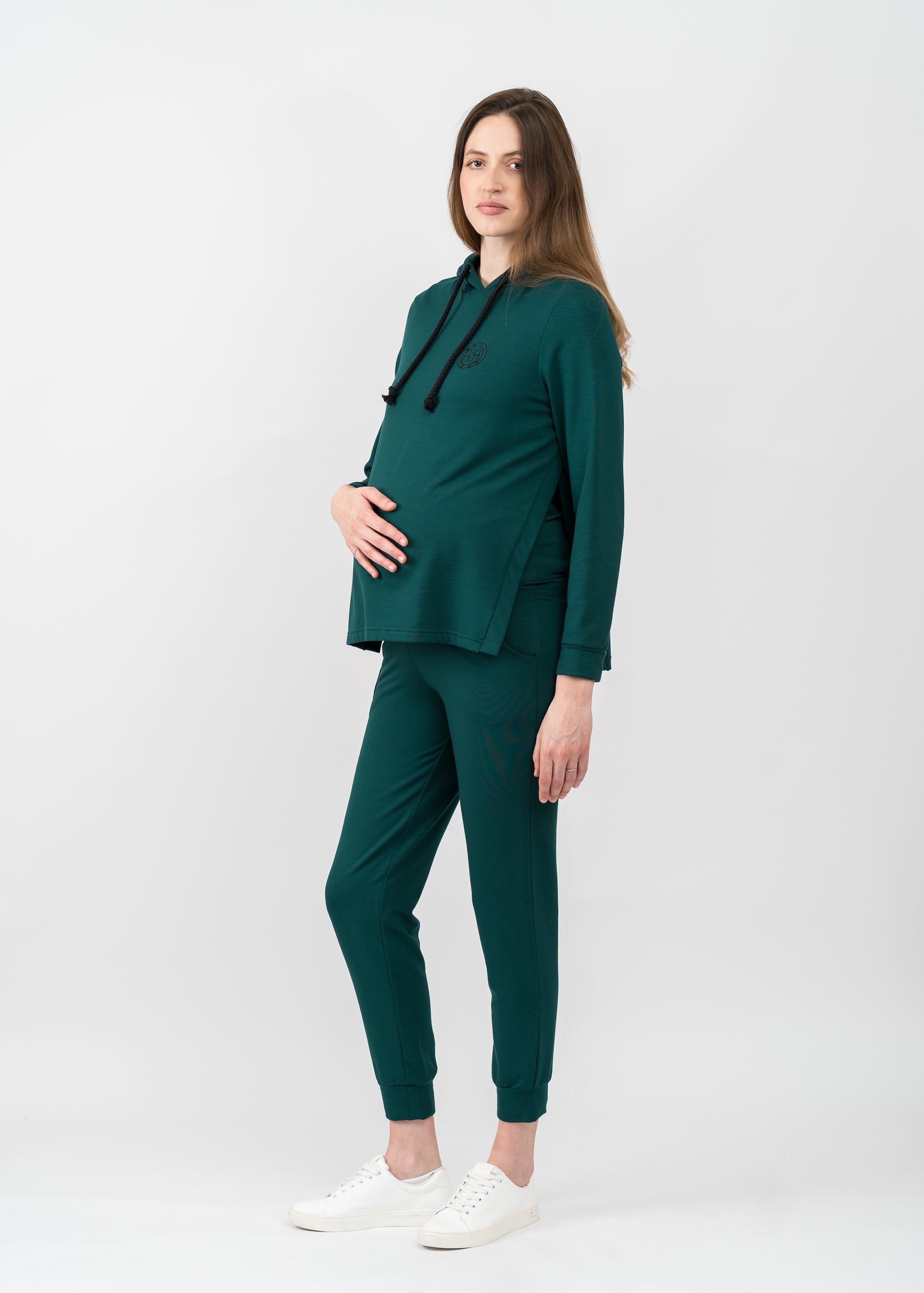 Umstandskapuzenpulli aus weichem Strickstoff in dunkelgrüner Farbe. Perfekt für kältere Tage. Der Kapuzenpulli ist flexibel, passt sich also dem wachsenden Bauch an und sorgt für einen hohen Tragekomfort. Er sieht toll aus mit Trainingsanzügen, Leggings oder verwaschenen Jeans. Er ist perfekt für einen Spaziergang mit dem Baby oder einen Einkaufsbummel mit einer Freundin.