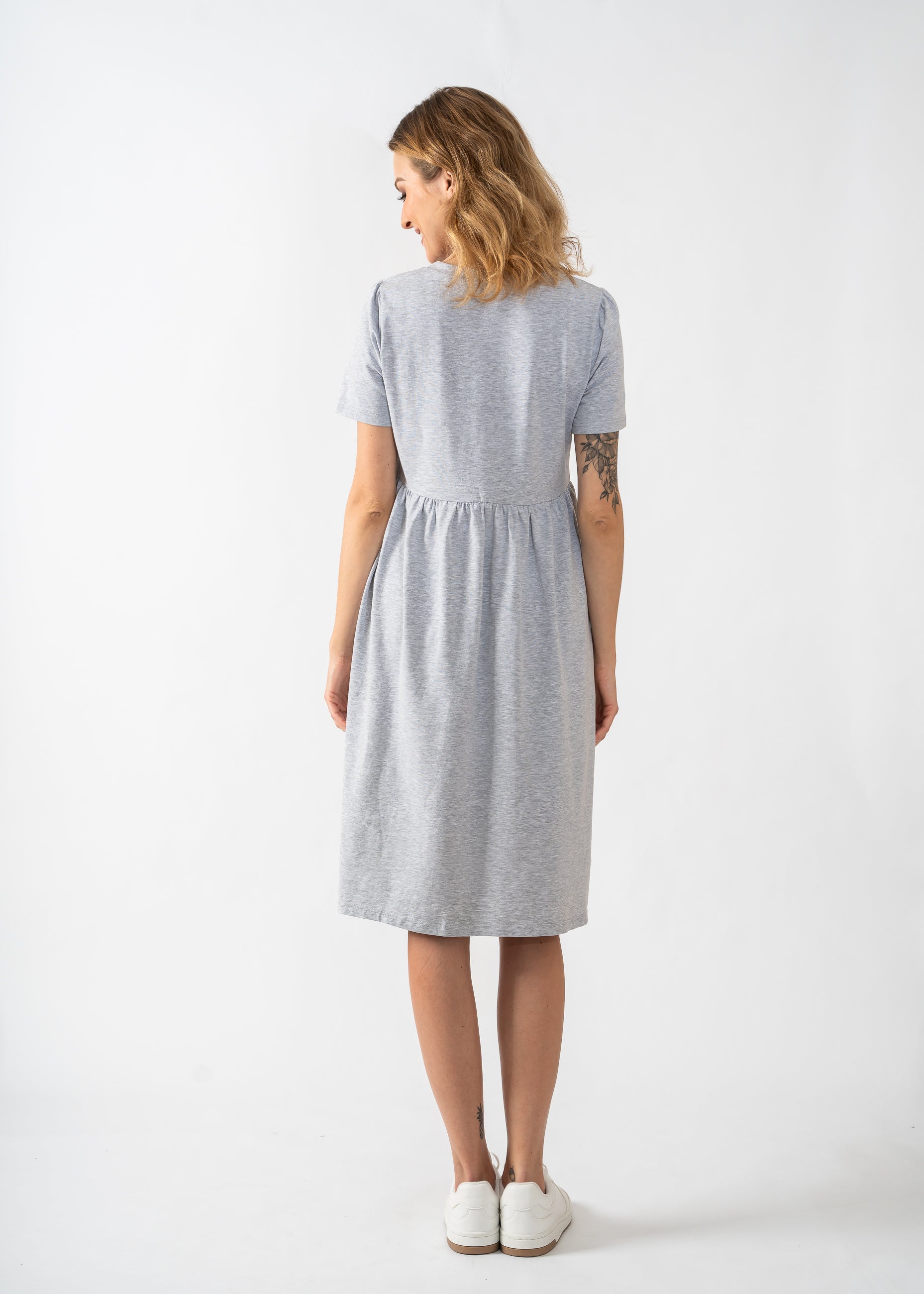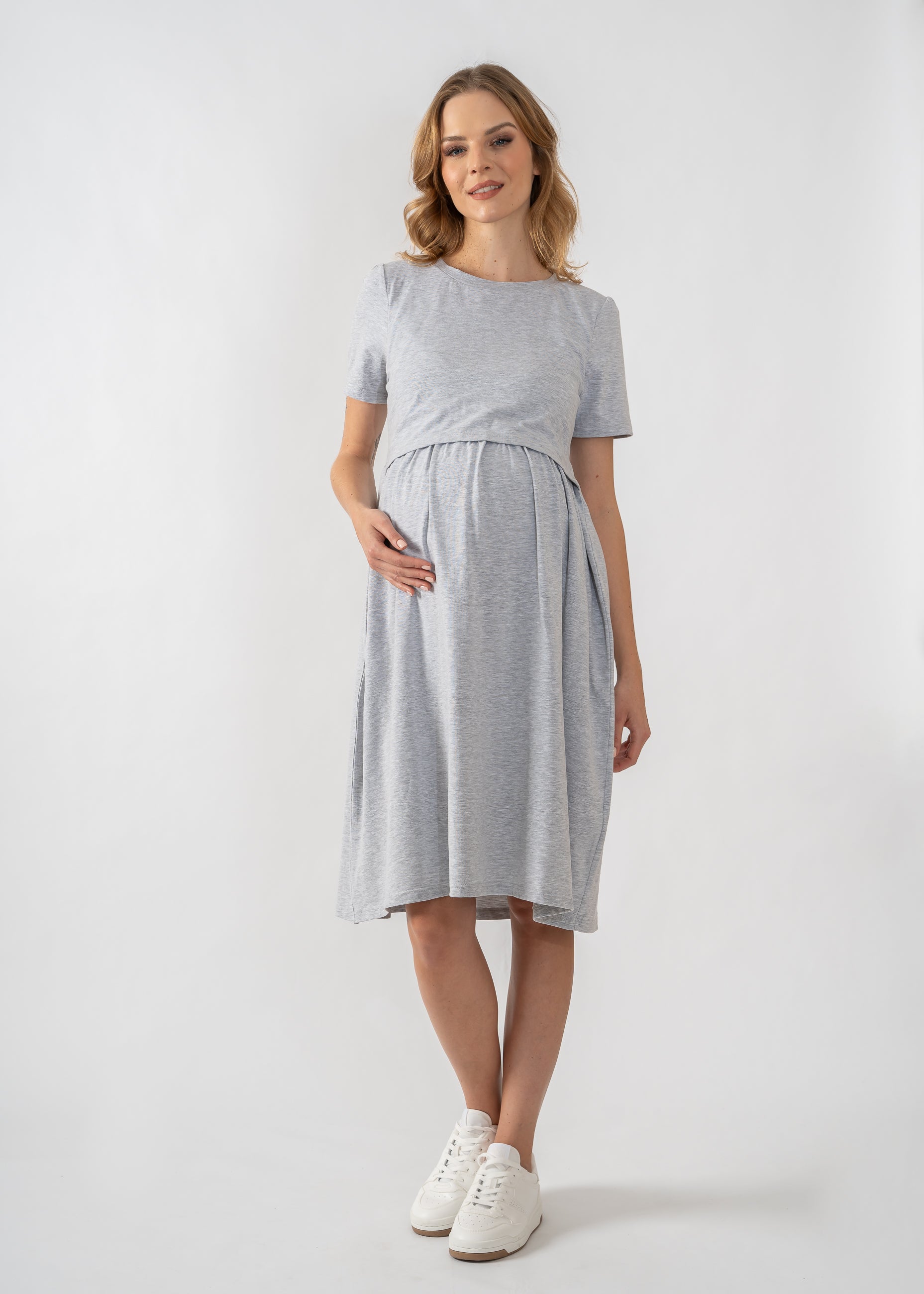 Kurzärmeliges Kleid für Schwangere in Grau. Es ist aus einem bequemen Strickstoff gefertigt, der sich sanft an die Figur anschmiegt. Es wurde speziell für schwangere Frauen entworfen, eignet sich aber auch gut für die Stillzeit. Das Kleid ist mit einem speziellen Einsatz versehen, der das Stillen erleichtert - ohne Verschlüsse, Reißverschlüsse oder Knöpfe. So können Sie überall diskret und bequem stillen. Das Kleid passt sich Ihrem wachsenden Bauch an und bietet Ihnen während der gesamten Schwangerschaft einen hohen Tragekomfort.