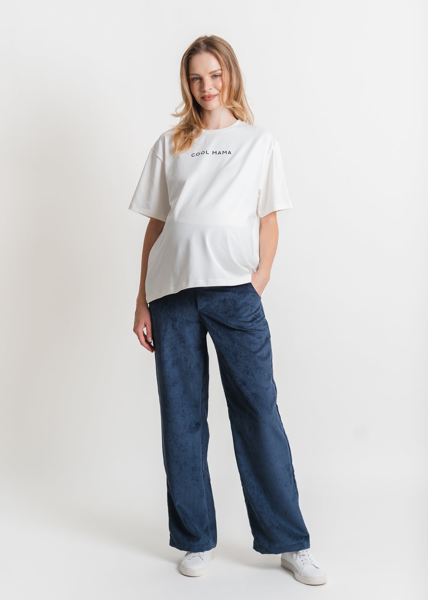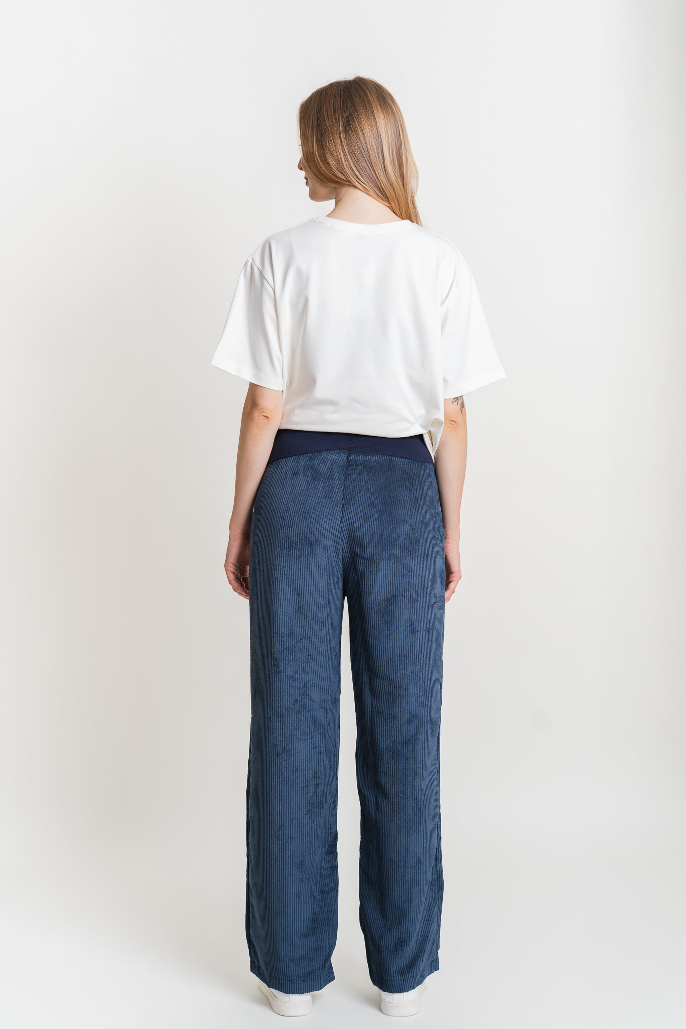 Schwangerschaftshose mit weitem Bein aus weichem Stoff in klassischem Marineblau, mit entsprechend hohem und elastischem Bund passt sich dem wachsenden Bauch an und bietet der werdenden Mama Komfort. Durch den aufgerollten Bund kann das Produkt auch nach der Schwangerschaft lange verwendet werden. Diese Hose ist die perfekte Ergänzung zu jedem Outfit.