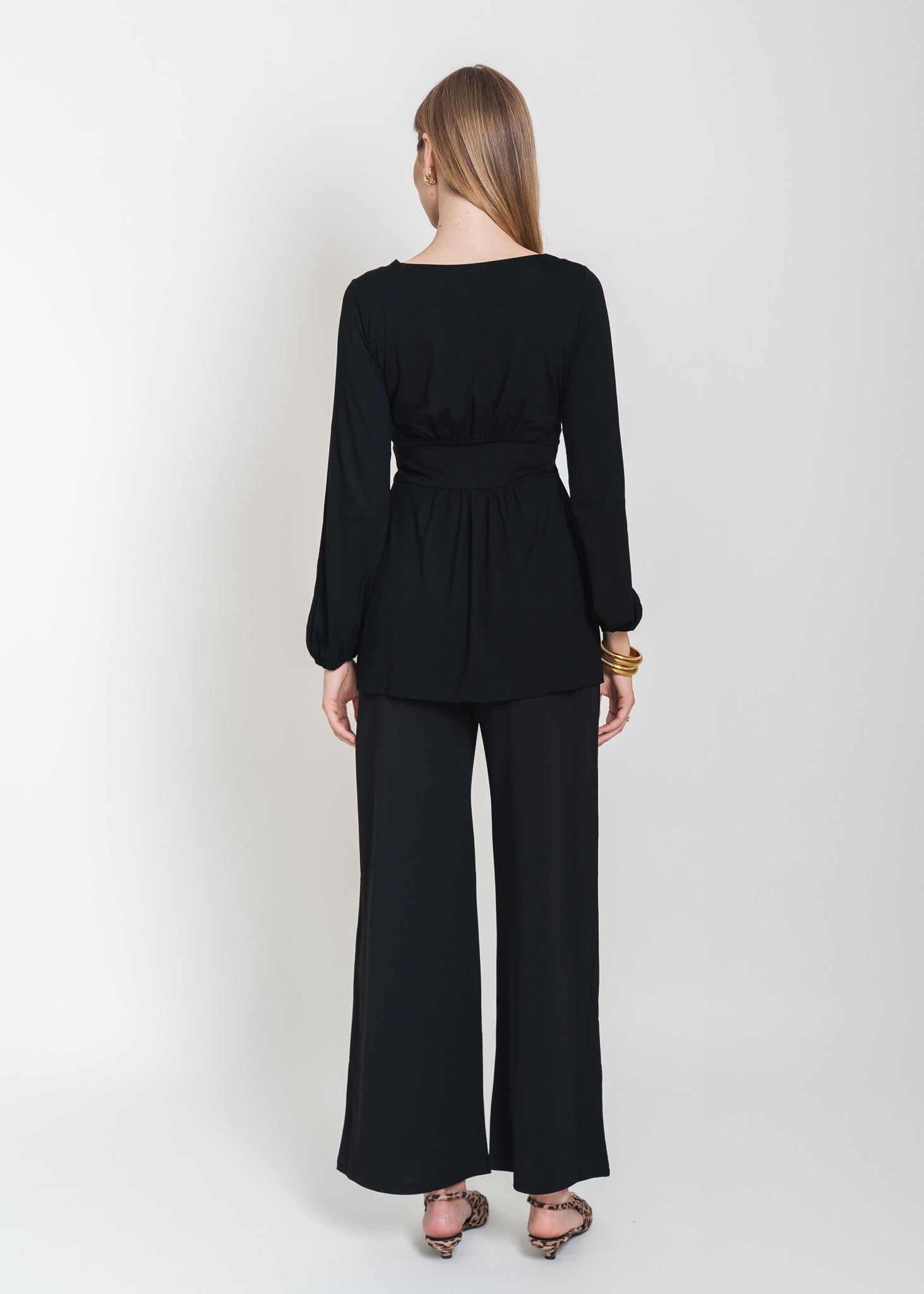 Umstandsbluse in schwarz Farbe aus weichem Stoff. Es wurde speziell für schwangere Frauen entwickelt, funktioniert aber auch während der Stillzeit gut. Es verfügt über ein spezielles, von Cool Mama patentiertes Panel, das das Füttern des Babys erleichtert – ohne Druckknöpfe, Reißverschlüsse und Knöpfe. Es ist eine praktische und diskrete Lösung, die jede stillende Mutter lieben wird. Die Bluse ist unter der Brust geschnitten und wird nach unten hin breiter, so dass sie sich während der Schwangerschaft dem wachsenden Bauch anpasst.